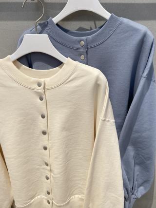 表面が綺麗な裏毛カーディガンはボリューム袖がながら軽い着心地で春も使えます。