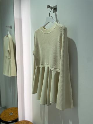 コンパクトなニットのウエストから広がる、異素材のペプラムシルエットが魅力的なプルオーバー。