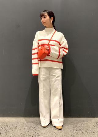 タートル部分は、着ただけで決まる長さになっているので、 折ったりさせずに、そのまま着るのがおすすめ。 短丈なので、マリンパンツのようにウエストにディテールのあるパンツや、ハイウエストのボトム合わせをぜひ。