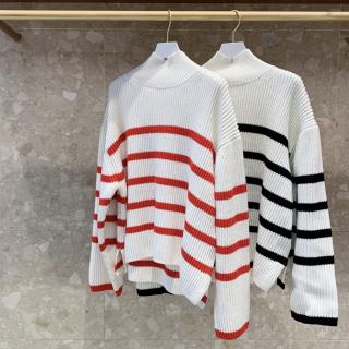 身幅はオーバーサイズでゆったりとしつつ、絶妙な短丈に仕上げたゆるいバランスが素敵なタートルニット。顔まわりにはラインを抜いたり、袖口にはラインを添えて引き締めたりと、メリハリがありつつも、すっきりと抜け感のあるボーダーに仕上げているのがポイント。袖が筒の様なワイドスリーブになっており袖口も広めなので、くるっとラフに折りあげて着ても素敵な一着。