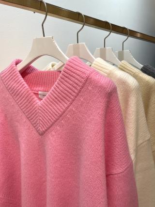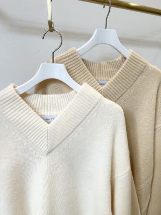 シンプルながらも、こだわりのディテールで着映えるフォルムに仕上げた、オーバーシルエットが魅力のVネックニットプルオーバー。前後差のある着丈で、脇線を少し前側にふったデザイン。立体的な袖のシルエットが着用時のアクセントになっており、ネックまわりをあえて立体的な太幅のリブにすることで首が華奢に見え、顔まわりがすっきりするのも嬉しいポイント。