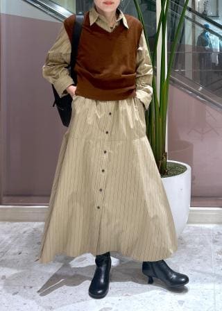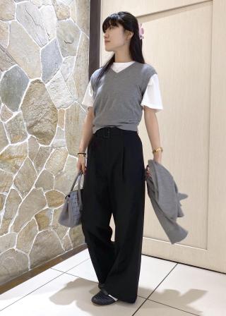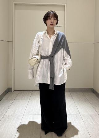 セットで着用時はボトムはハイウエストなデニムやカジュアルパンツがおすすめ。