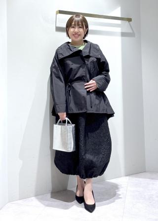 フェミニンなディテールのデザインを艶やかでモードな印象の糸を使用し、甘すぎない印象に仕上げた1着。