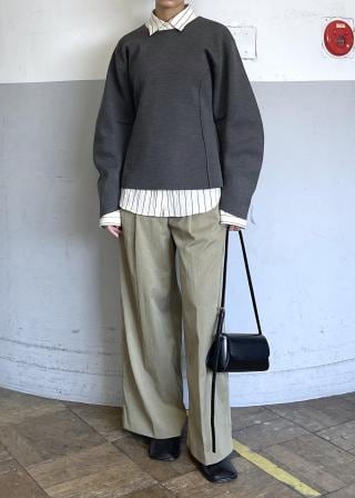 柔らかい生地で着心地がすごく良く、形がとても綺麗で一枚で綺麗見えしてくれます。袖のボリューム感と首元の空きのバランスも◎