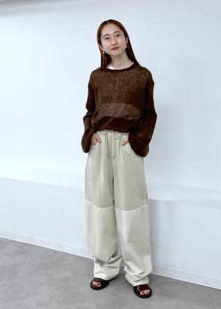 裾には共糸のテープを通しており、絞り具合を調節する事でフォルムに変化を加え、ボトムスとのバランスをアレンジして着用が可能。