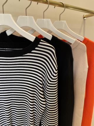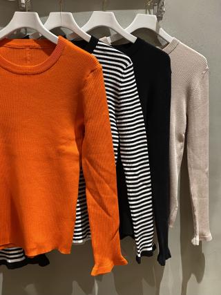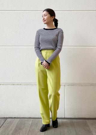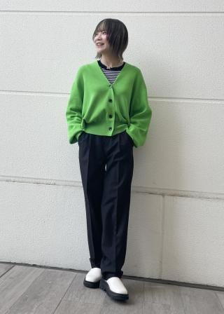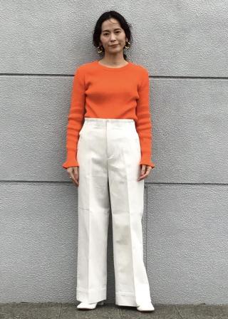 コンパクトなリブニットなので、どんなボトムとも好相性。ボーダー×カラーパンツで合わせたり、発色のきれいなオレンジをデニムでカジュアルに合わせたりがおすすめ。また、同素材のクルーネックカーディガンとアンサンブルで着ても素敵。