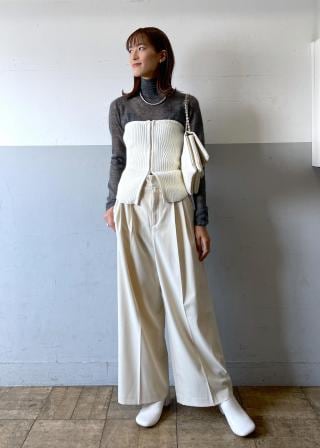 バストの目立てがデザインになっている、どこかセンシュアルな雰囲気が魅力のニットビスチェ。ダブルのオープンジップなので、下を開けてスリットのように着用し、抜け感のある着こなしが可能なデザイン。脇と上端には滑り止めテープが付いており、ずり落ちる事なくきれいに着用できるのも嬉しいポイント。