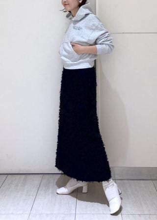 胸元のロゴがワンポイント。大きめのフードで小顔効果のあるデザイン。ウエスト部分のリブがしっかりしていることによる溜まり感があり、トレンドシルエットを叶えてくれる一着。