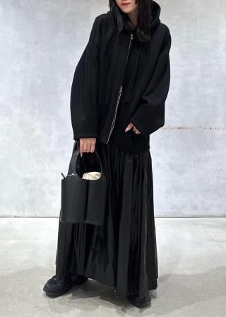 素材の特性を生かした立体的なフードや、バックスタイルにタックをとることでコクーンシルエットに仕上げ、ラフにならず大人カジュアルに決まるフーディー。