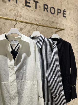 パイピングが際立つブラック(無地・パイピング:オフホワイト)、爽やかな印象のあるホワイト×ネイビー寄りブラックのストライプ柄、パイピングがコーディネートを引き締めてくれるオフホワイト(無地・パイピング:ブラック)の、計3色展開。