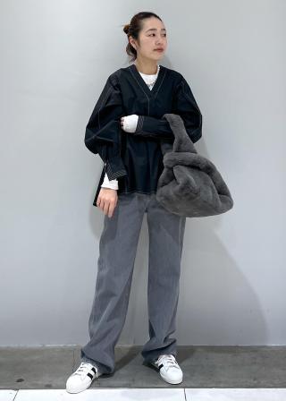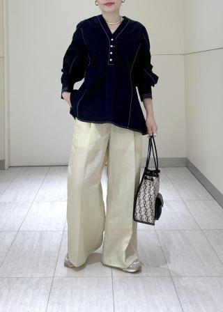 ヒップ丈のペプラムブラウスにはスリムパンツやリーンスカートと合わせたスタイリングがおすすめ。あえてのワイドパンツでメンズライクな印象をプラスしたスタイリングも。