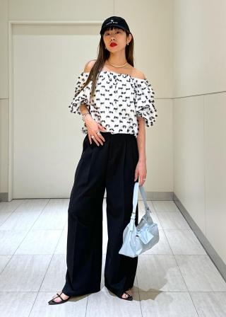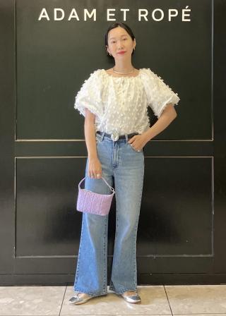 ワイドデニムやリーンシルエットスカートとの合わせがおすすめ。オフショルダーで着用する際、首の詰まったタンクトップ合わせも素敵なので是非。