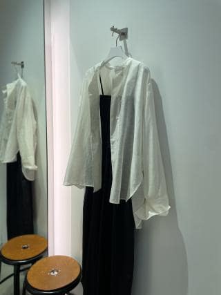 ゆったりとしたサイズ感とワイドスリーブが大人っぽいリラックスシアーシャツ。太めの前立てや、ワイドカフス等、シアー部分とのコントラストもポイント。バックには釦開きのスリットが入っているので、スタイリングに合わせて遊べると共に、夏には涼しさもアップ。ワイドスリーブの袖口幅はカフスの釦により調節が可能。インナー次第でロングシーズン着用可能な点も魅力。