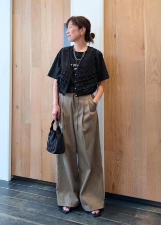 ロングTシャツやキャミソールにレイヤードするのがおすすめ。ボトムはデニムパンツやスラックス、綺麗めスカート合わせが好相性。上にジャケットを羽織り、フロントからフリルを少し見せて着用するのも素敵なので是非。