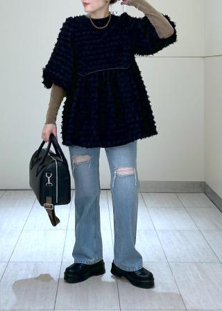 素材感と透け感があるので、黒でも春に着ても重すぎない印象で、デニムやスカートなど何でも合わせられ、便利です♪