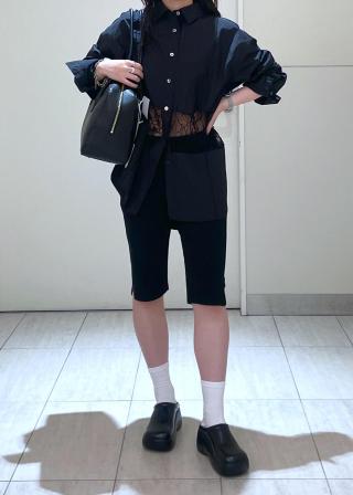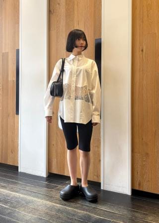 シンプルなシャツ型をベースに、ローウエスト位置に同色レースを配置したシャツ。