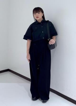 コンパクトな丈感なので、デニムなどのボリュームのあるボトムとのコーディネートがおすすめ。