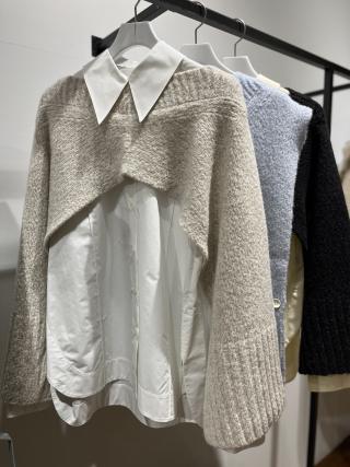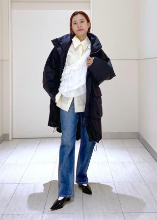 オンオフ着用出来る汎用性のあるシャツなので、様々に楽しんで。袖カフスは折り上げての着用はもちろん、折り返さずに、袖下のボタンを開けて着用するとモードな雰囲気になって素敵なのでぜひ。襟、裾、袖カフスにポイントがあるので、ニットとレイヤードして、部分的に見せるのもおすすめ。ジャケット+サイクルパンツ+ロングブーツや、タイトスカート合わせもぜひ。