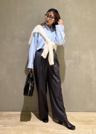 旬なショート丈シャツには、ハイウエストボトムがおすすめ。ボリュームのあるワイドパンツやハイウエストのスカートなどと合わせて。