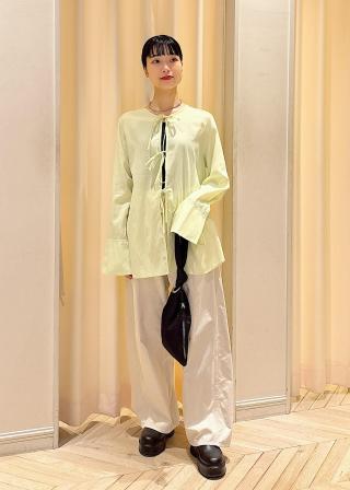 デニムやニットパンツ、ワイドスラックス合わせがおすすめ。