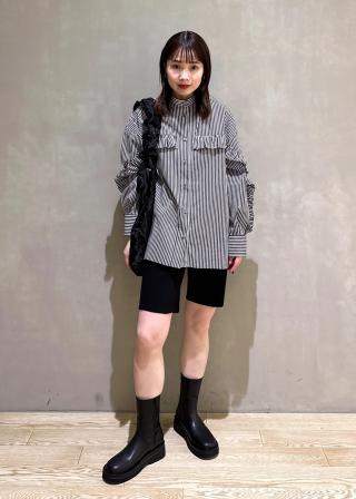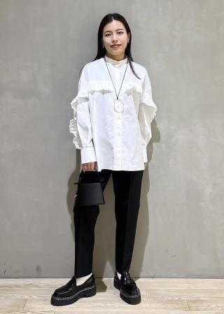 フロントから袖にかけて施したフリルデザインが華やかな、360度どこから見ても様になるブラウス。すっきりとしたバンドカラーにシャープな深めのサイドスリット、袖口のタックボリュームが甘すぎないこだわりポイント。