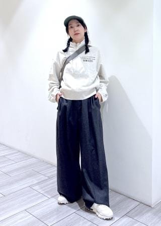 ZIPを開けてデコルテ見せすれば、女らしいスウェットスタイルにも。