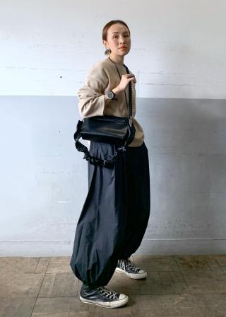 カジュアルなスタイリングだけではなく、とろみのあるボトムを合わせて女性らしい雰囲気に。