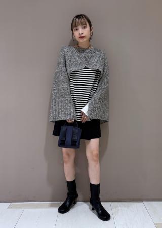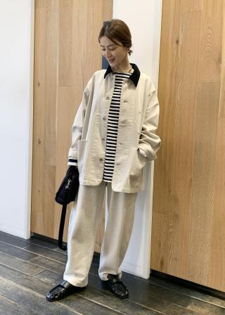 前身頃は細ピッチ、左袖を太ピッチのボーダーで仕上げ、ゆったりとしたリラックス感のあるオーバーサイズでご用意。