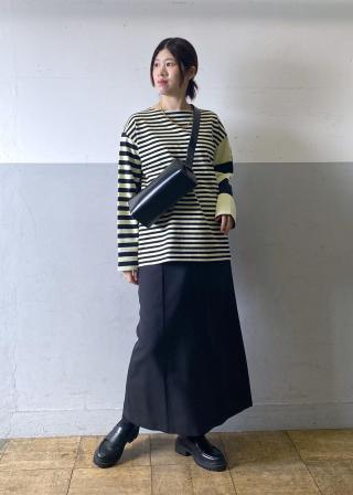 前身頃は細ピッチ、左袖を太ピッチのボーダーで仕上げ、ゆったりとしたリラックス感のあるオーバーサイズでご用意。