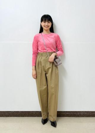 綺麗なピンクで華やかなトップスなので、レイヤードせずにメイン使いもオススメです。