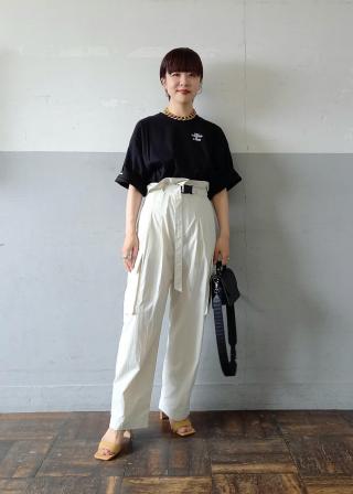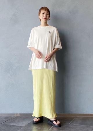 ルーズなシルエットのTシャツなので、スラックスパンツやリーンシルエットのスカートを合わせるなど、クリーンな着こなしがおすすめ。袖を折り返してプリントを見せたり、フロント部分をインにしたりと、ボトムや気分によってバランスを楽しんで。デニムと合わせた思いきりカジュアルなスタイルもぜひ。