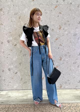 フリルデザインに甘さのあるデザインなので、ボトムにはパンツ合わせがおすすめ。リーンシルエットのスカートで女性らしい着こなしや、フリル単体をTシャツやワンピースと合わせるスタイルも素敵なのでぜひ。