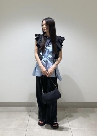 フリル:肩から袖ぐりへと続くアコーディオンフリルが特徴的なアイテム。前は繋がっておらず、リボンで結んで着用するエプロンタイプになっており、レイヤードアイテムとしてもおすすめ。前後どちらでも着用でき、表情に変化を付けられるのもポイント。