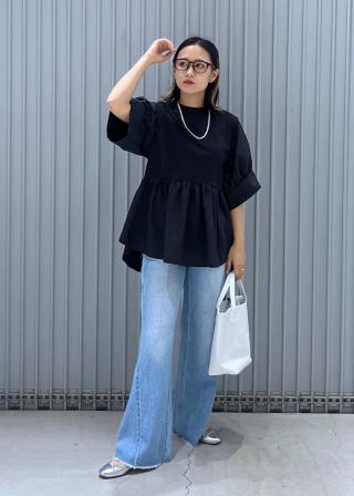 Tシャツのような楽な着心地ながら、フェミニンブラウスのような着映え感のでる、良いところ取りをしたクルーネックのプルオーバー。シャツテールカット風のペプラム仕様や、つんと跳ねた袖のカフスによるボリューム袖がデザインポイント。