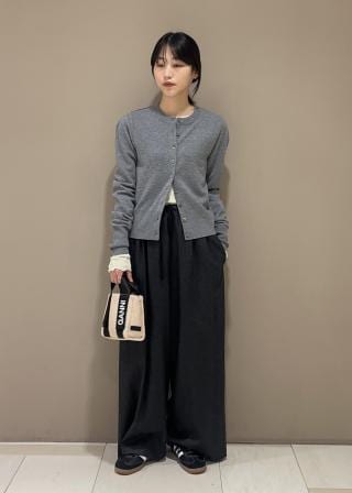 首元が詰まったクルーネックでフェミニンな印象になりすぎないのもポイント。