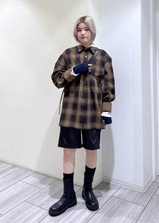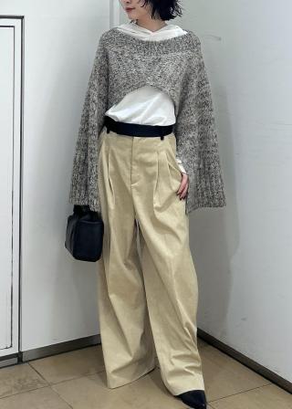 秋見え素材のコーデュロイやスエード、毛羽感のあるウール系など素材感のあるボトムとの合わせもおすすめ。