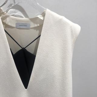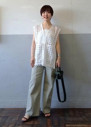 ストラップディテールを引き立たせるなら、胸元に開きのあるトップスやワンピースとの合わせをぜひ。同素材のリブパンツとセットアップで着用し、シャツやシャツワンピース、ジレなどを合わせての着用もおすすめ。