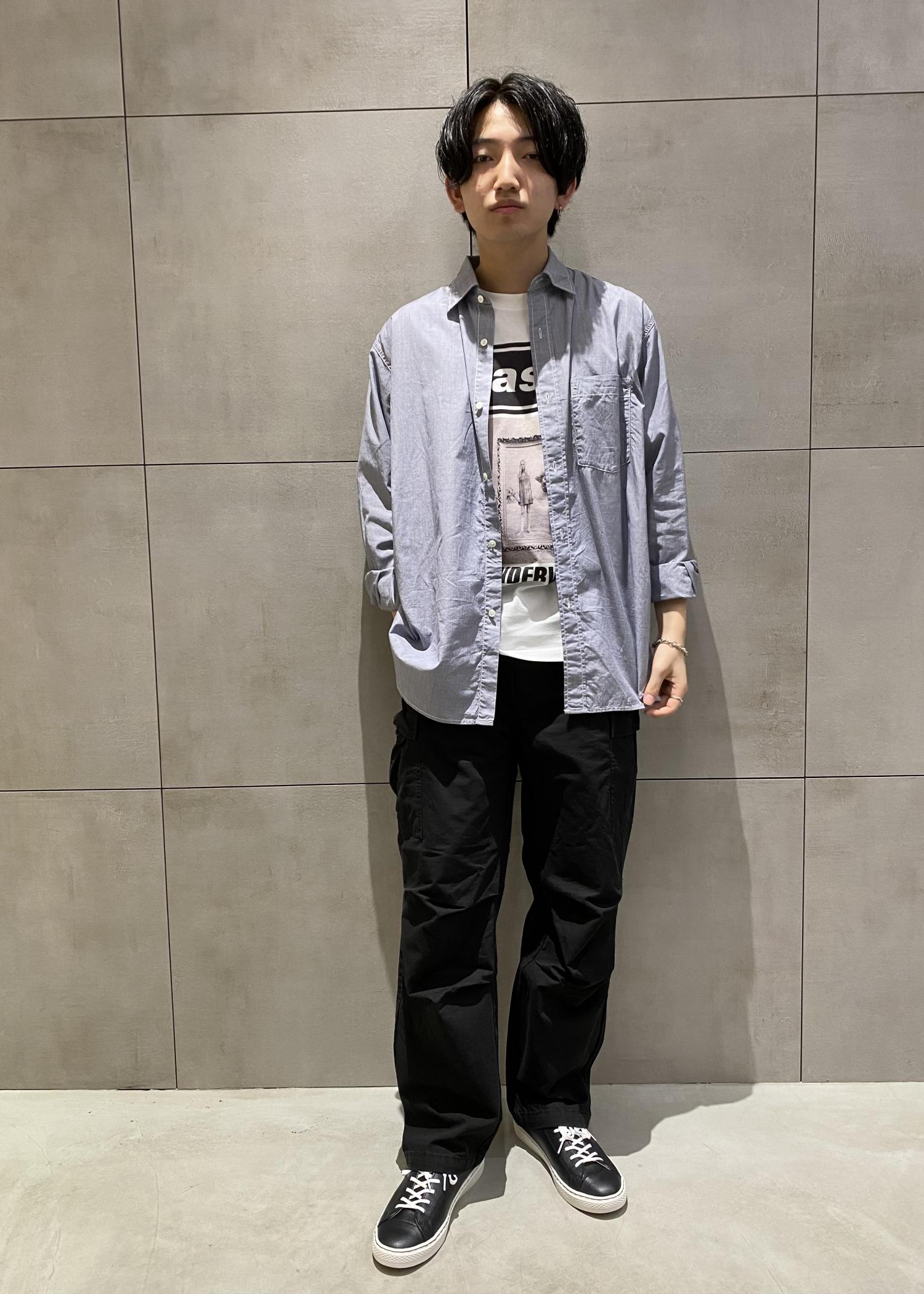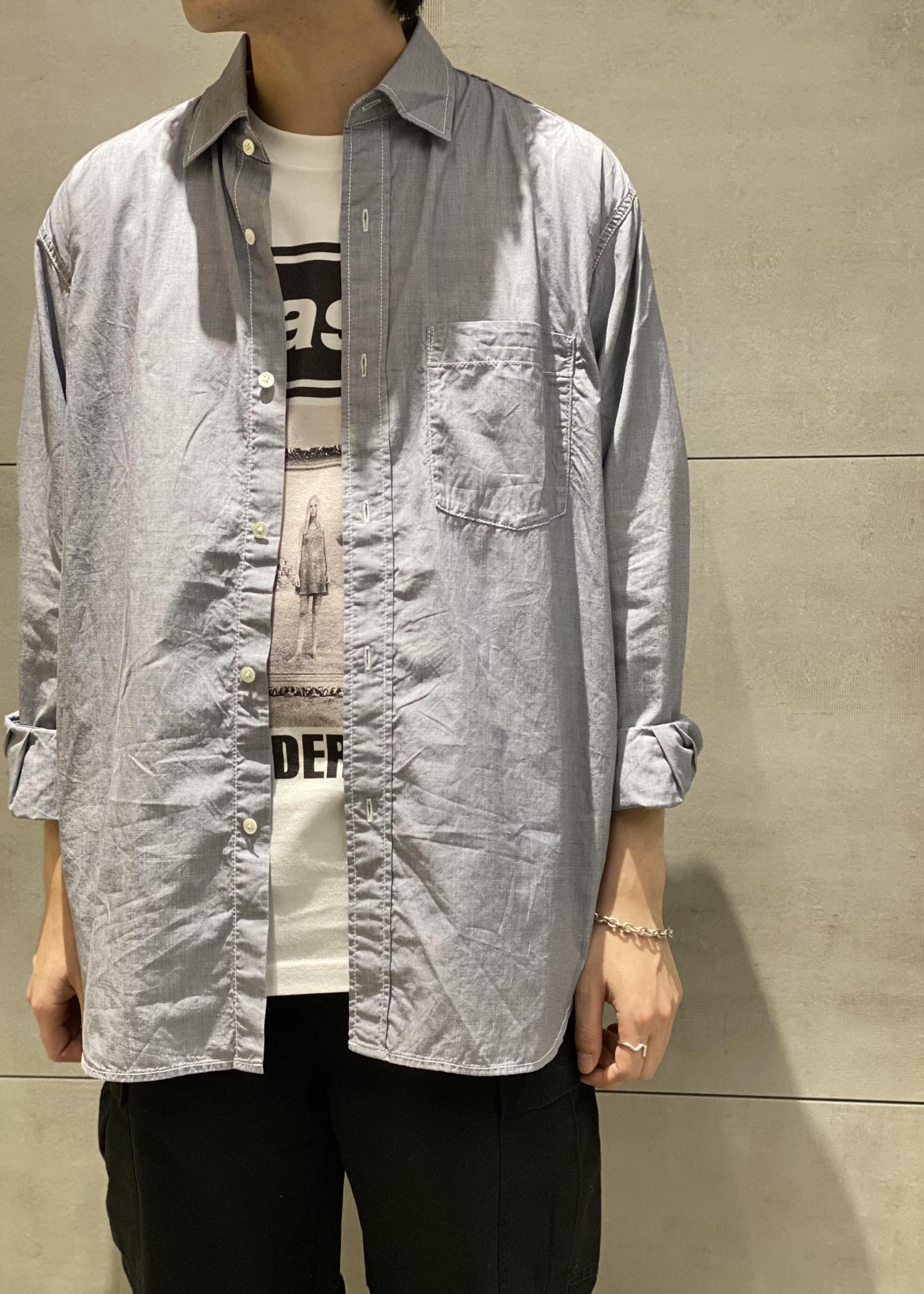一般的なドレスシャツとは違いゆとりのあるサイズ感なので今年の夏買った大きめのTシャツなどもすんなり着れて秋物の最初の買い物としてとても使いやすいアイテムとなっております。