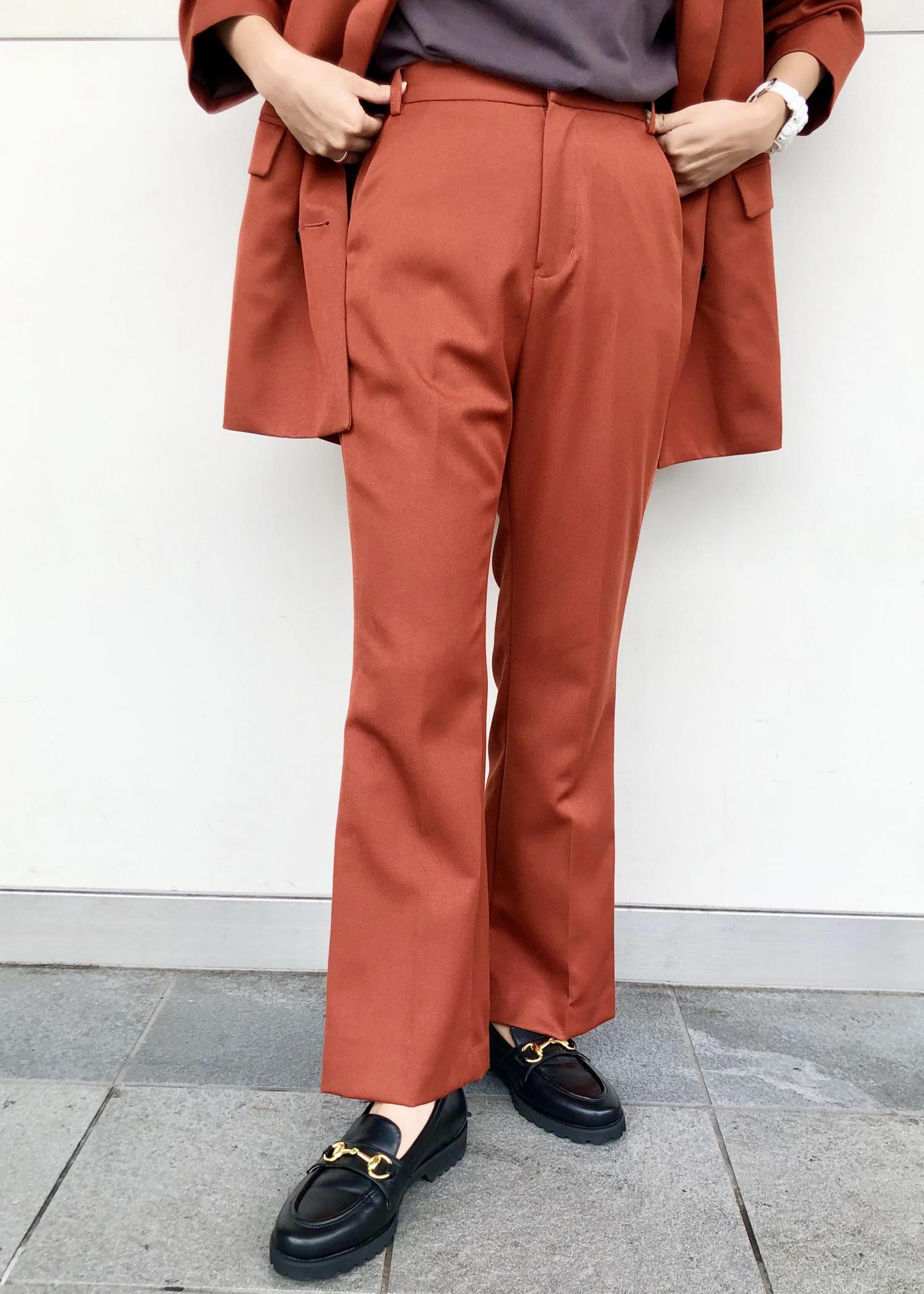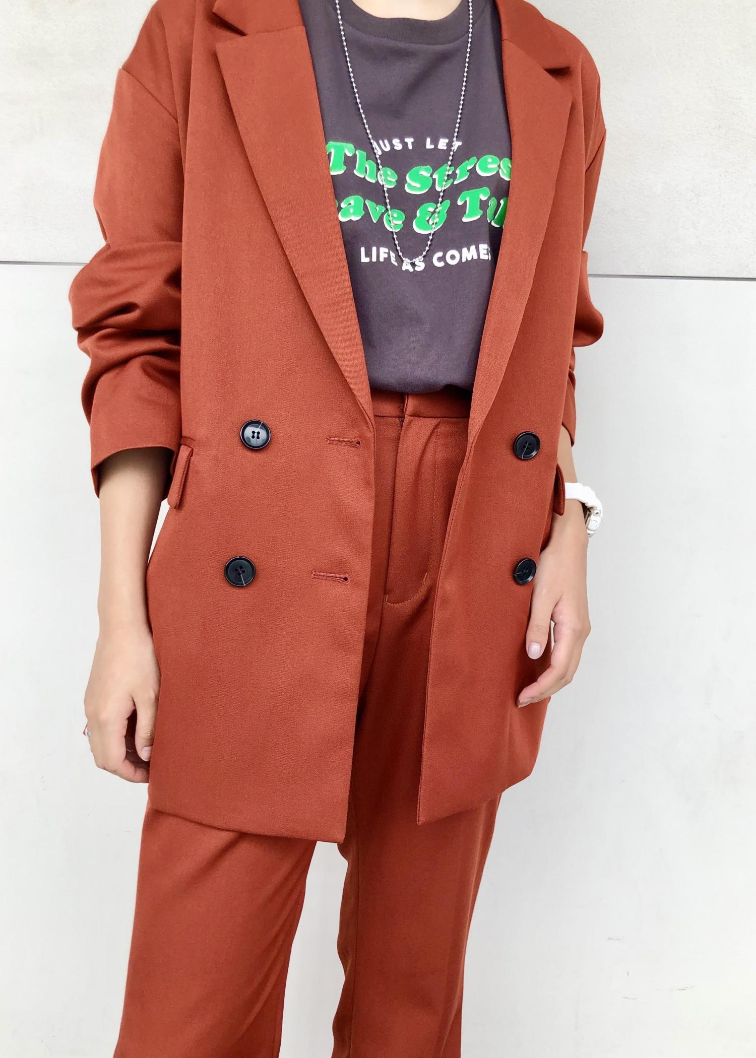 レトロなレンガカラーのセットアップ。 秋っぽさをもっとプラスしたかったので 暗めカラーのインナーを選びました。 もちろんホワイトでも顔まわりが明るくなって 女性らしい風合いで着て頂けます♡