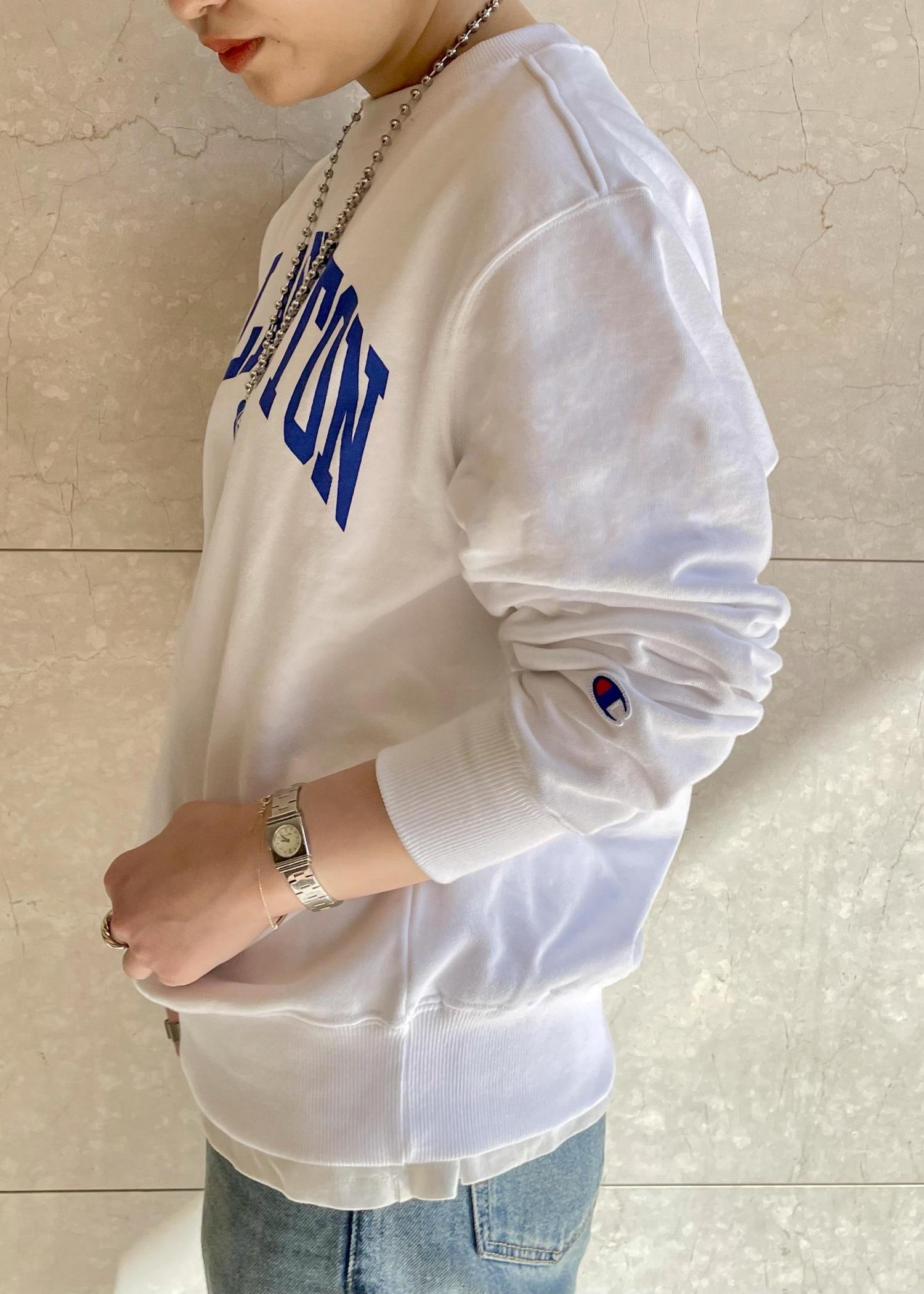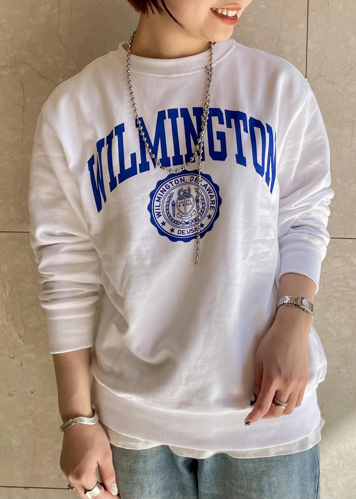 大きなカレッジロゴが今年らしいデザイン♪ ブルーのロゴが映える白のスウェットは 1枚でコーディネートの主役になります! スウェットとデニムのカジュアルコーディネートに ローファーを合わせてマニッシュな印象にしました♪