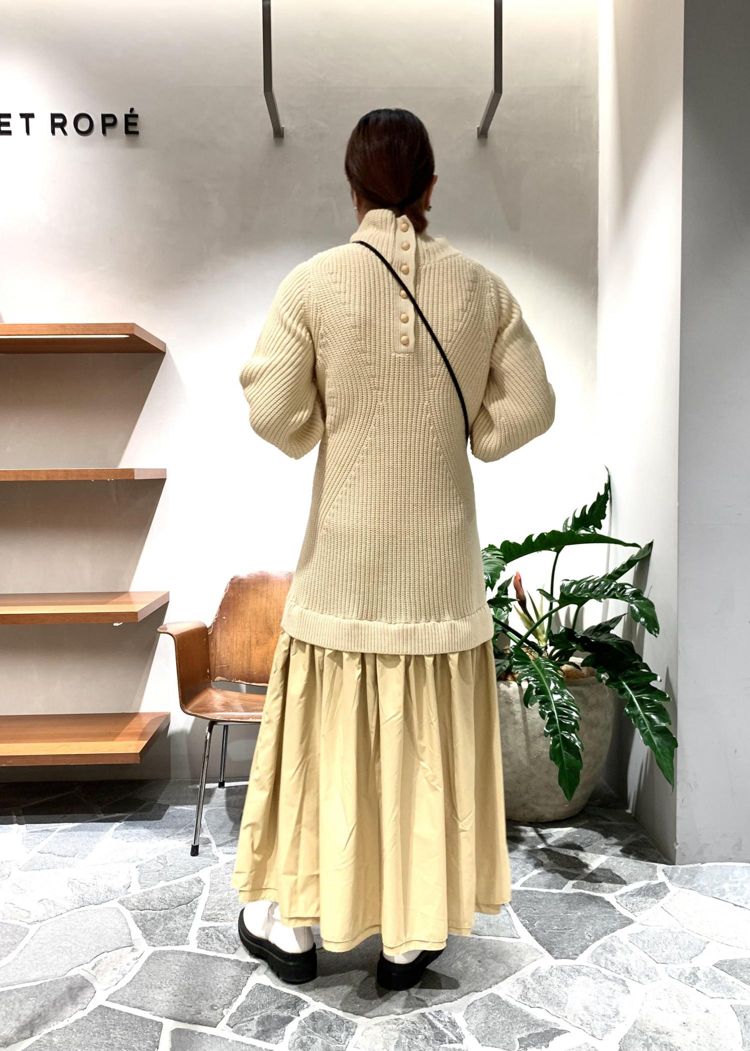 ふんわりとした軽いニットとハリのあるスカートがドッキングされたデザインワンピース。