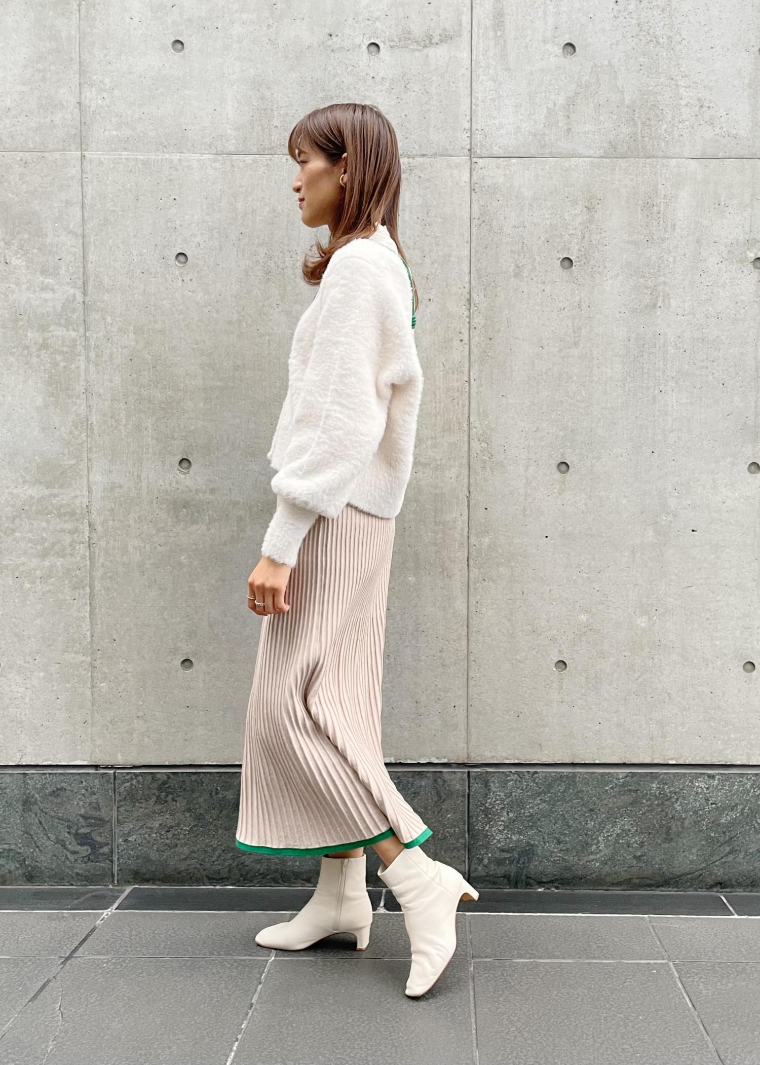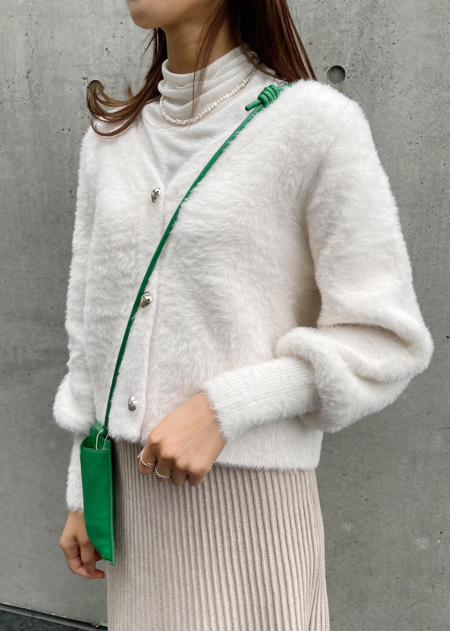 【スタイリングポイント】ふわっとした白のカラーと素材が可愛いフェザーカーディガンに、すっきりシルエットのマーメイドスカートでメリハリをつけたコーディネートです。