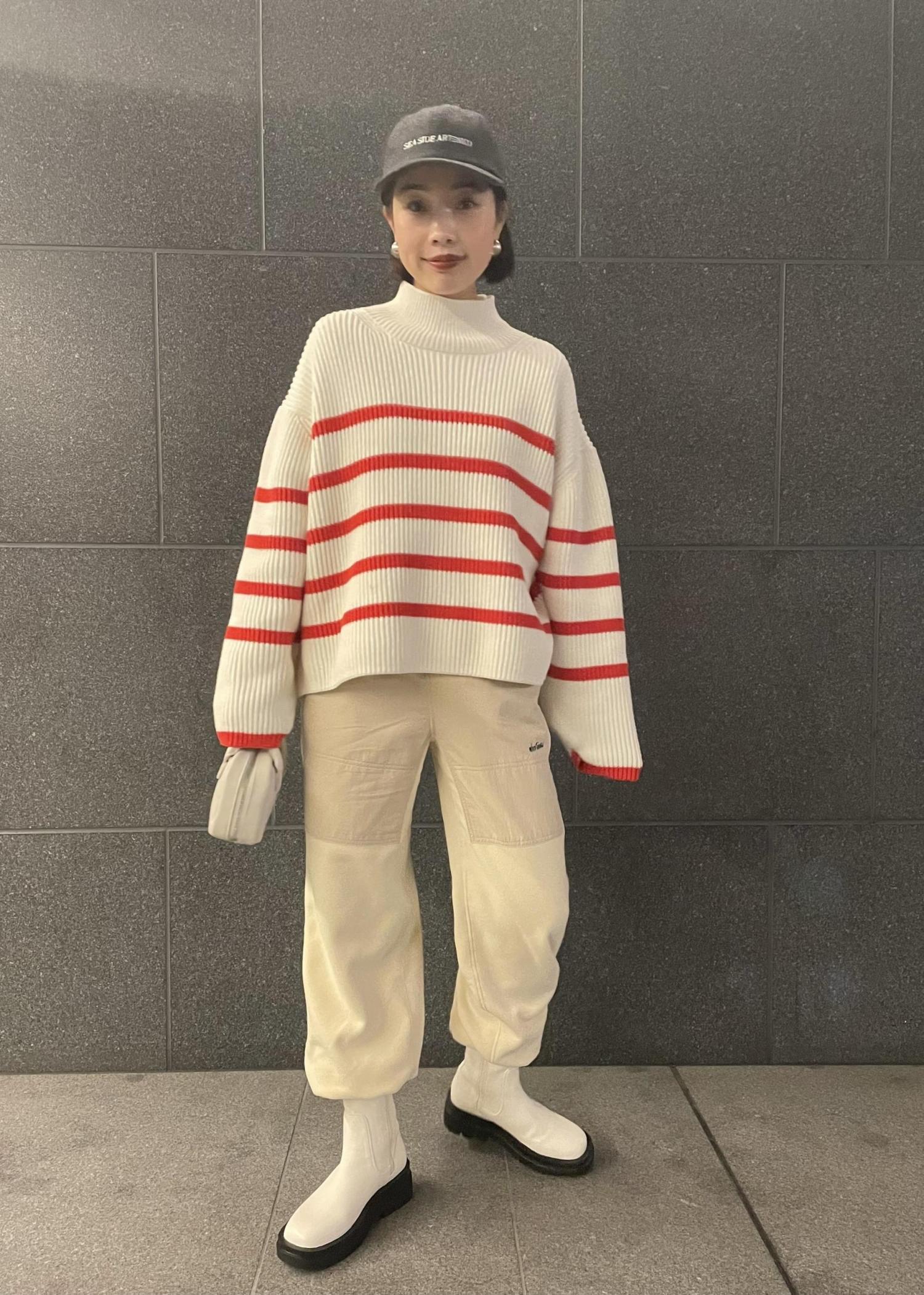 今回はボーダーの柄がアクセントのニットと合わせたスタイリングにしました。