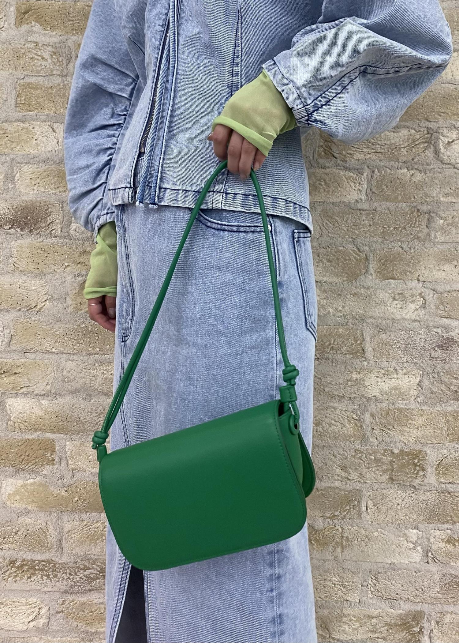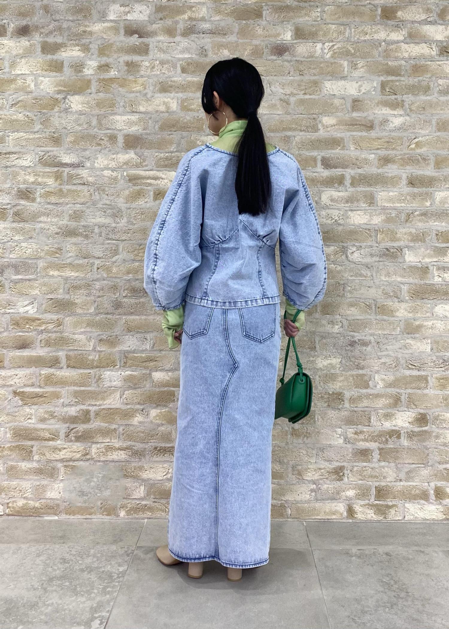 カジュアルなイメージのデニムですが、ブラウスはギャザーたっぷりで大きな袖とキュッと絞られたウエスト、スカートは思い切ったスリットが華やかです。