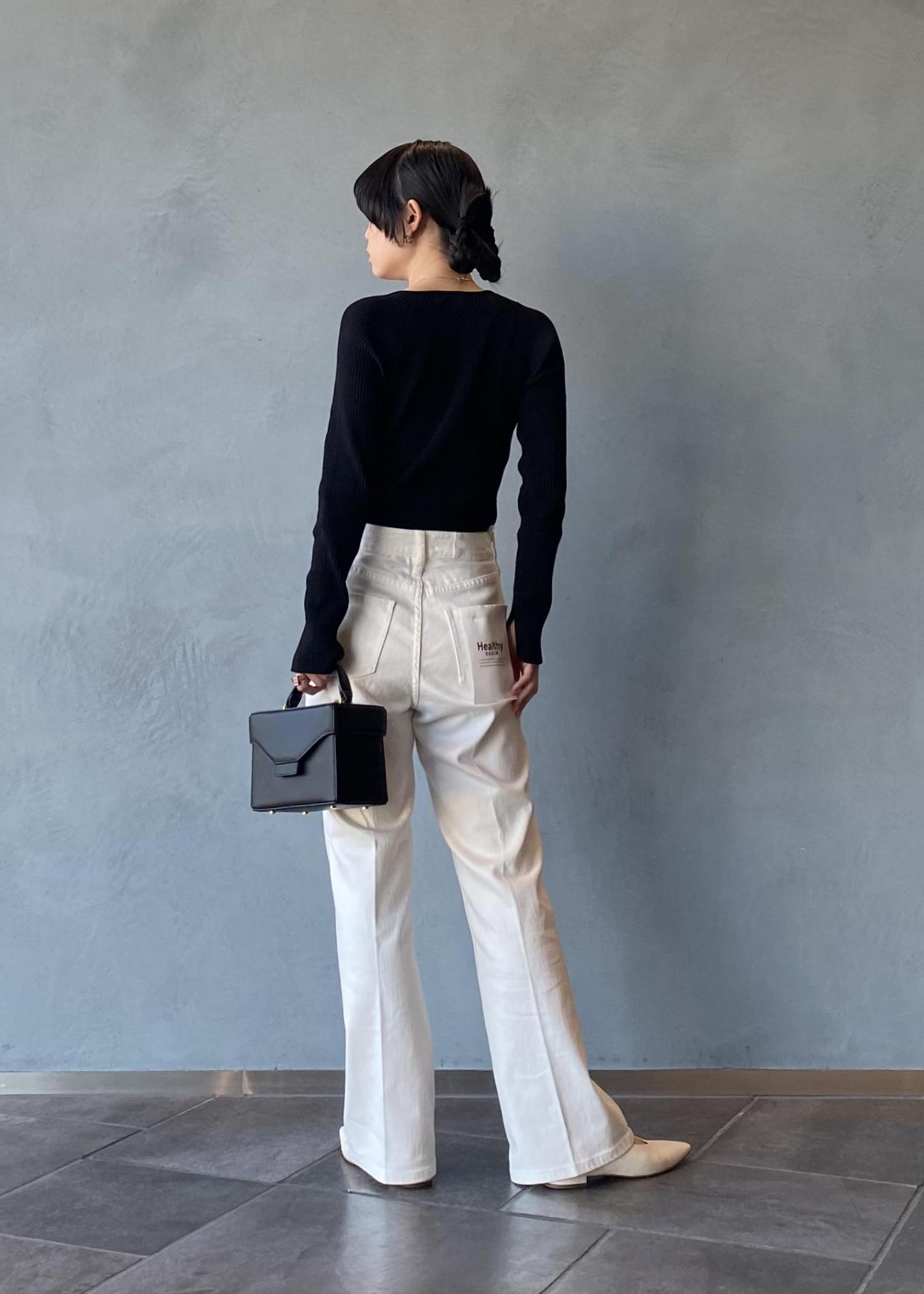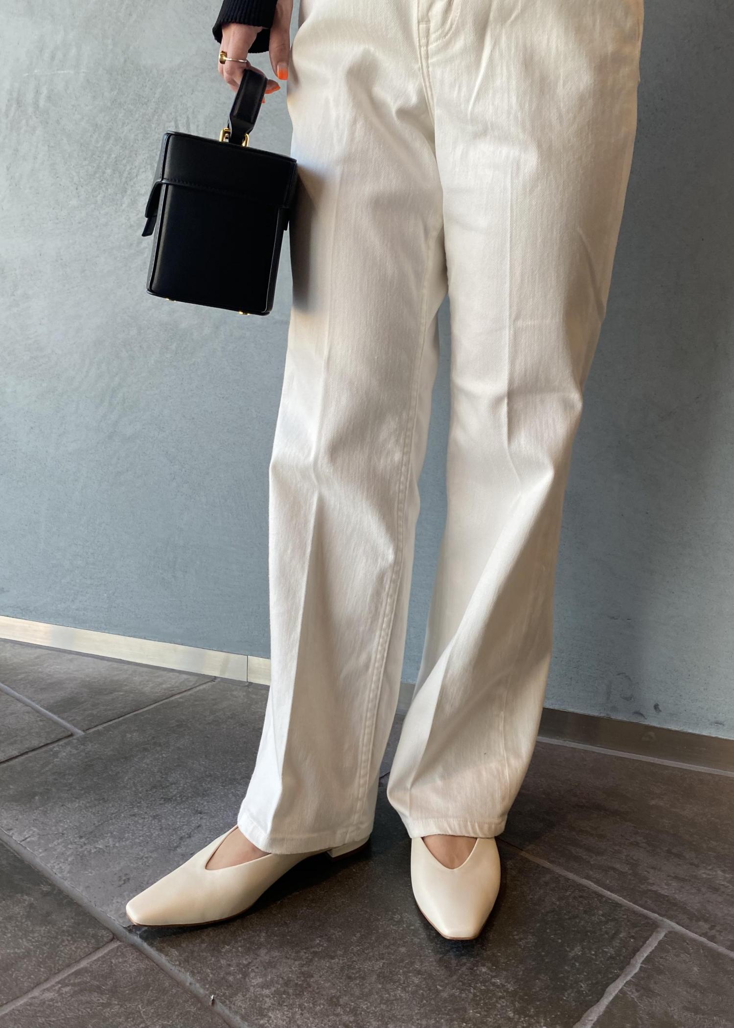 ボトムはセンタープレスでこれまたキリッとした印象なのですが、素材が柔らかいデニムで決めすぎない余裕のある雰囲気を演出してくれます。