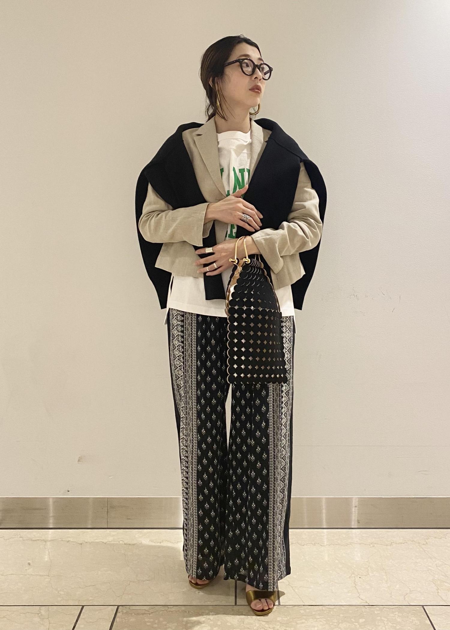 今回はフットボールロングTシャツにリラックス感のある柄ボトムを合わせて、少しカジュアルダウンしてコーディネートしてみました。