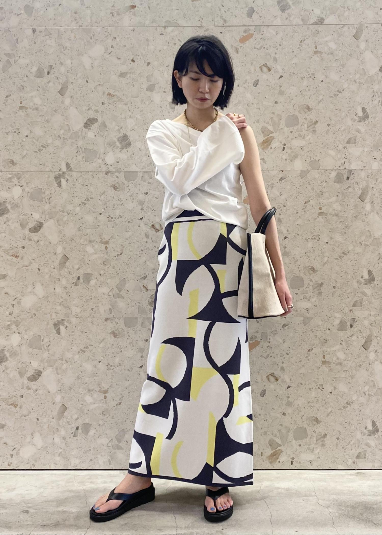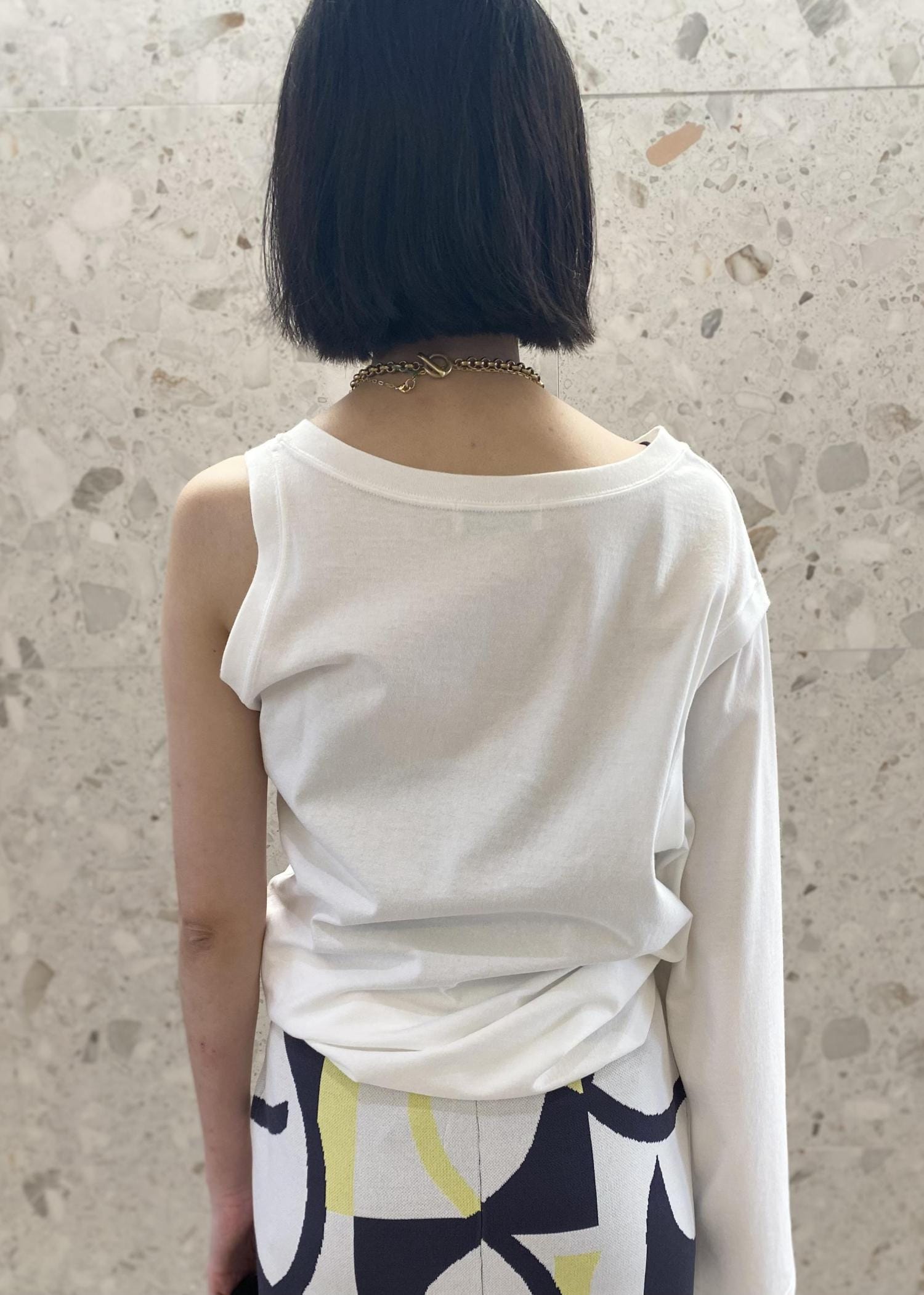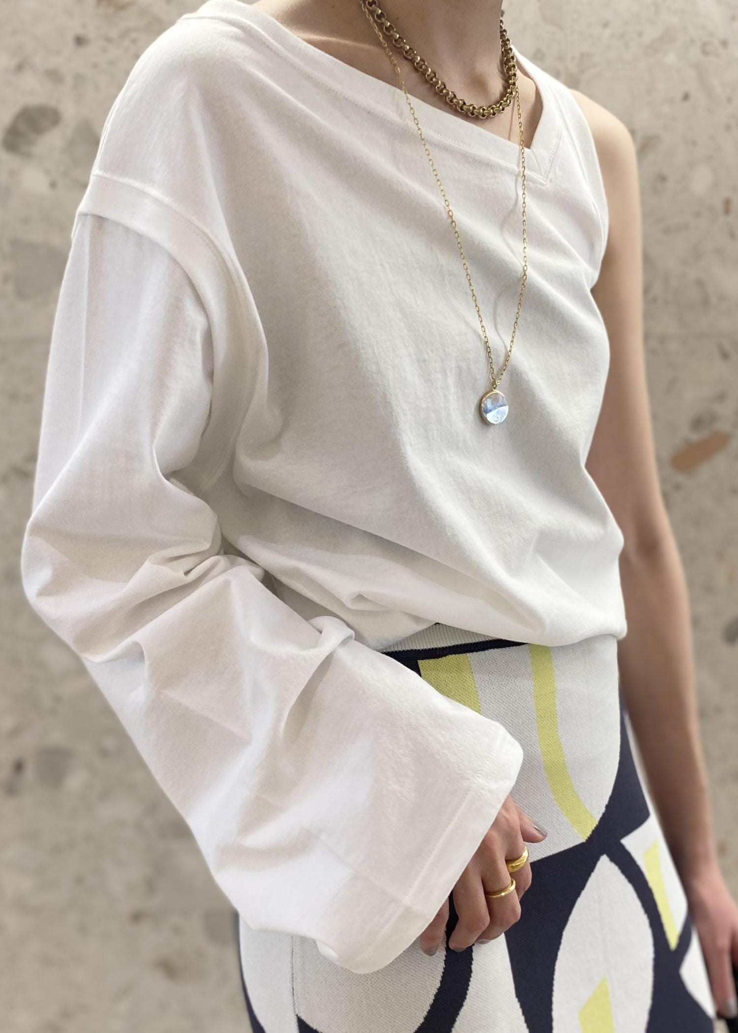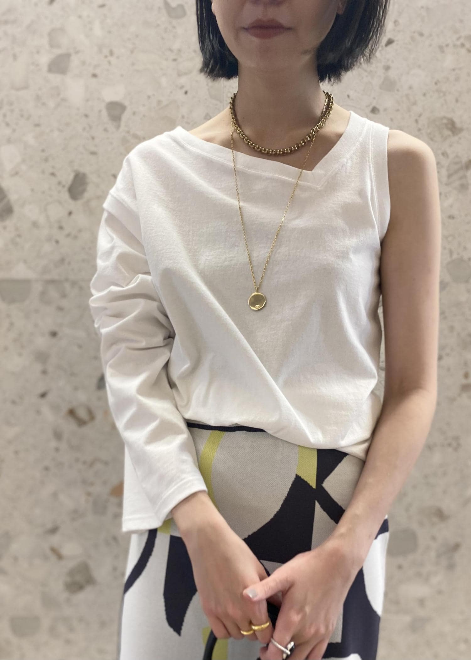 お袖が左右アシンメトリーになったトップスと合わせてみました。