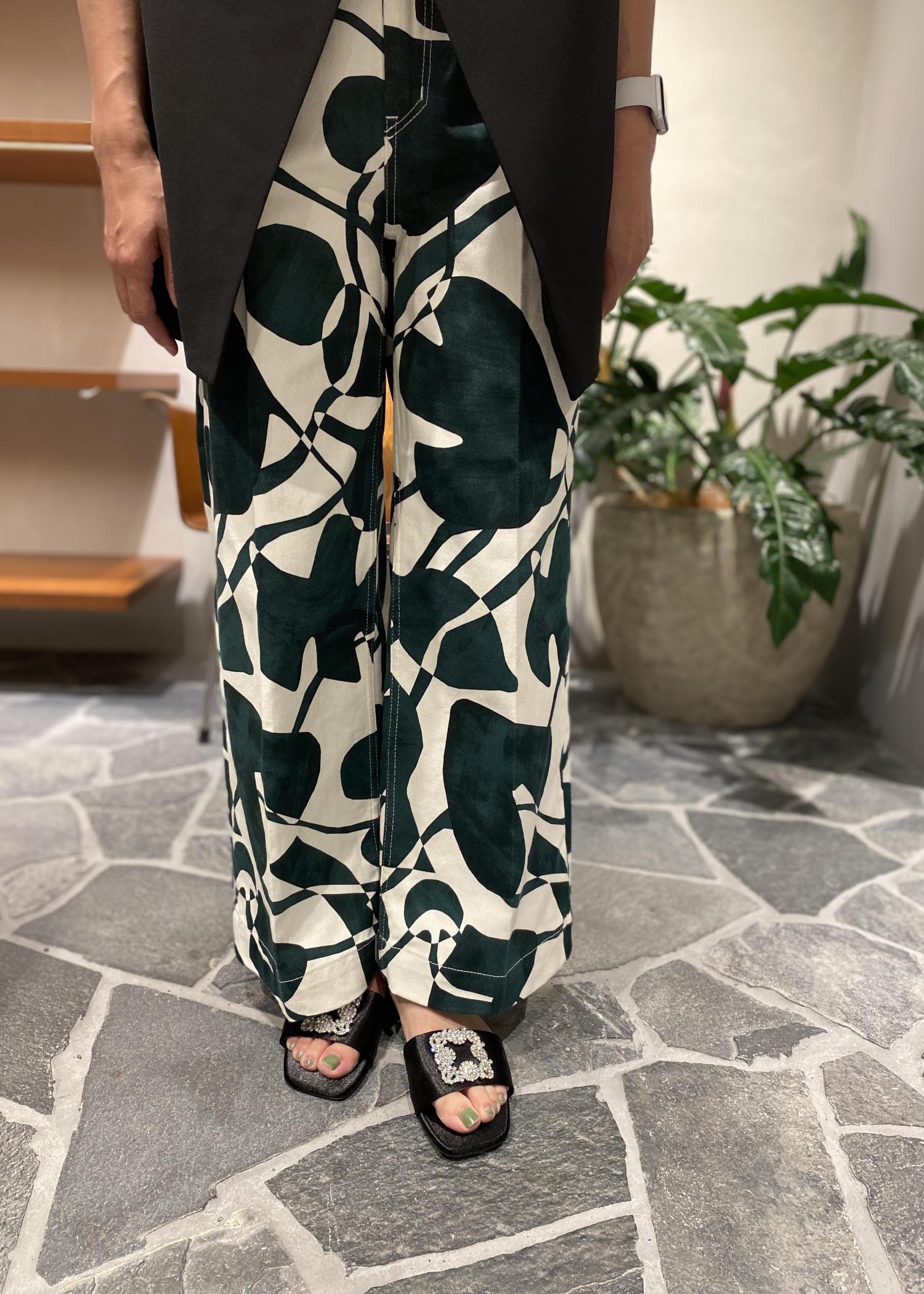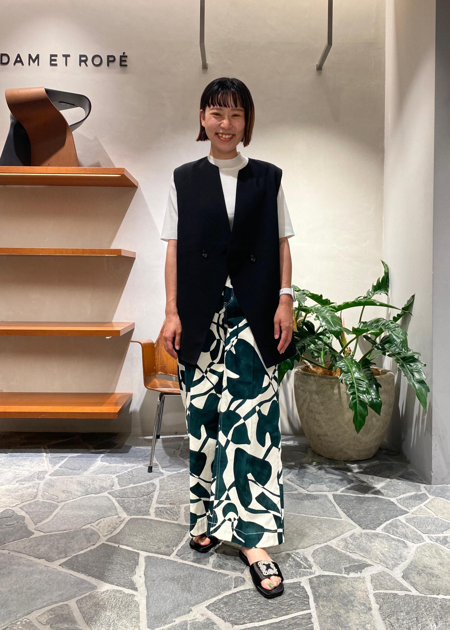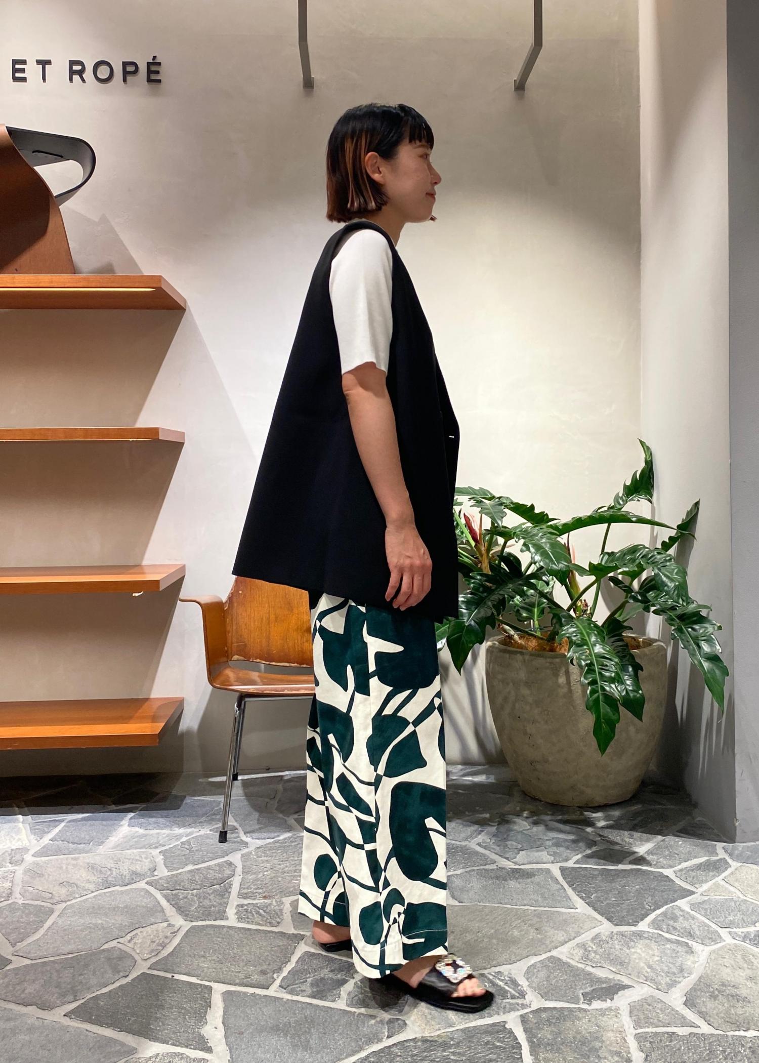 PHEENYの大胆なリーフ柄のパンツはハイウエストでスタイルアップも叶えてくれるので、トップスをインしてジレからウエスト位置が見えるように☆