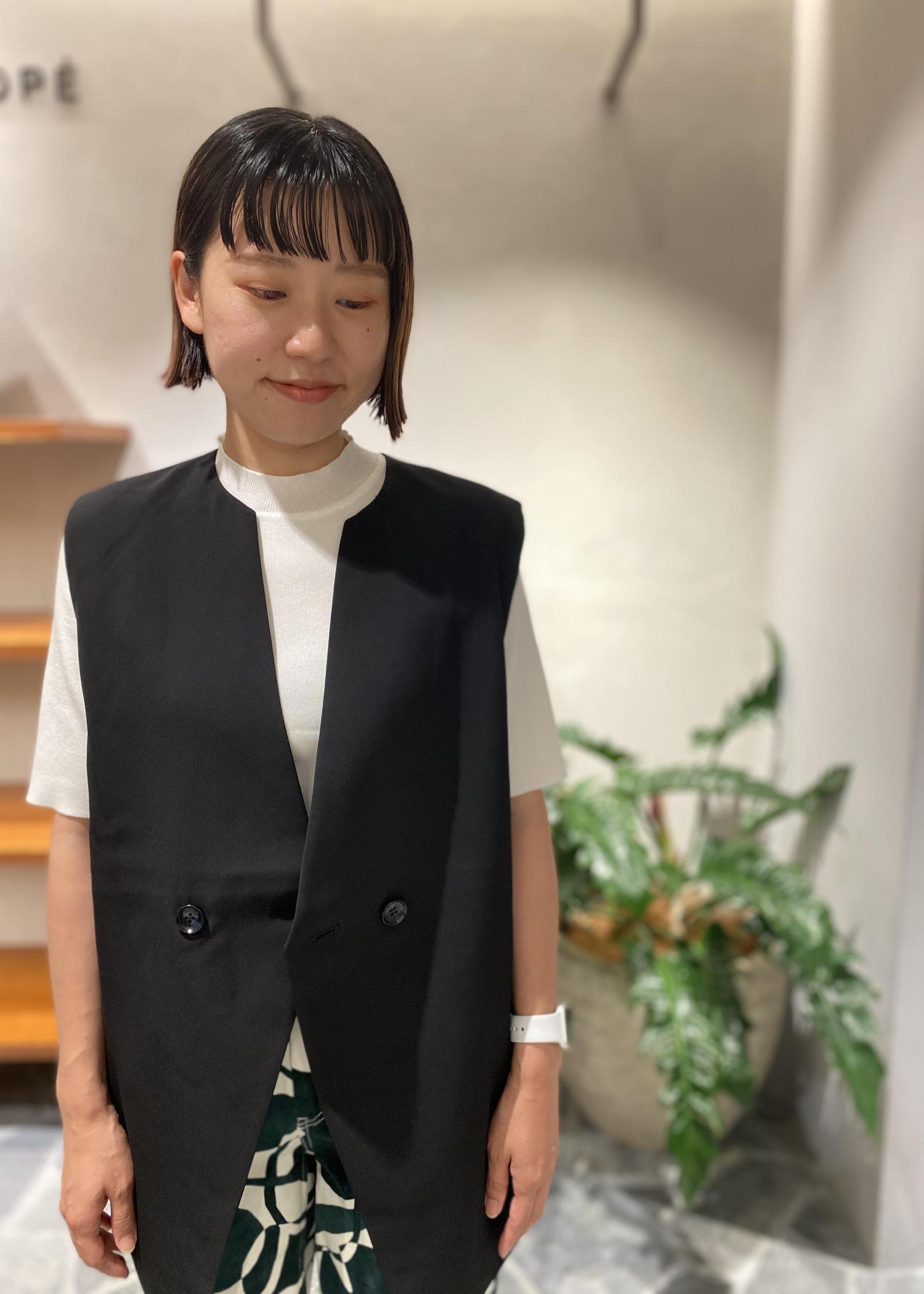 ジレの形がとても綺麗で丈感もヒップまで隠れる良い丈感なので、パンツスタイルで合わせてみました。
