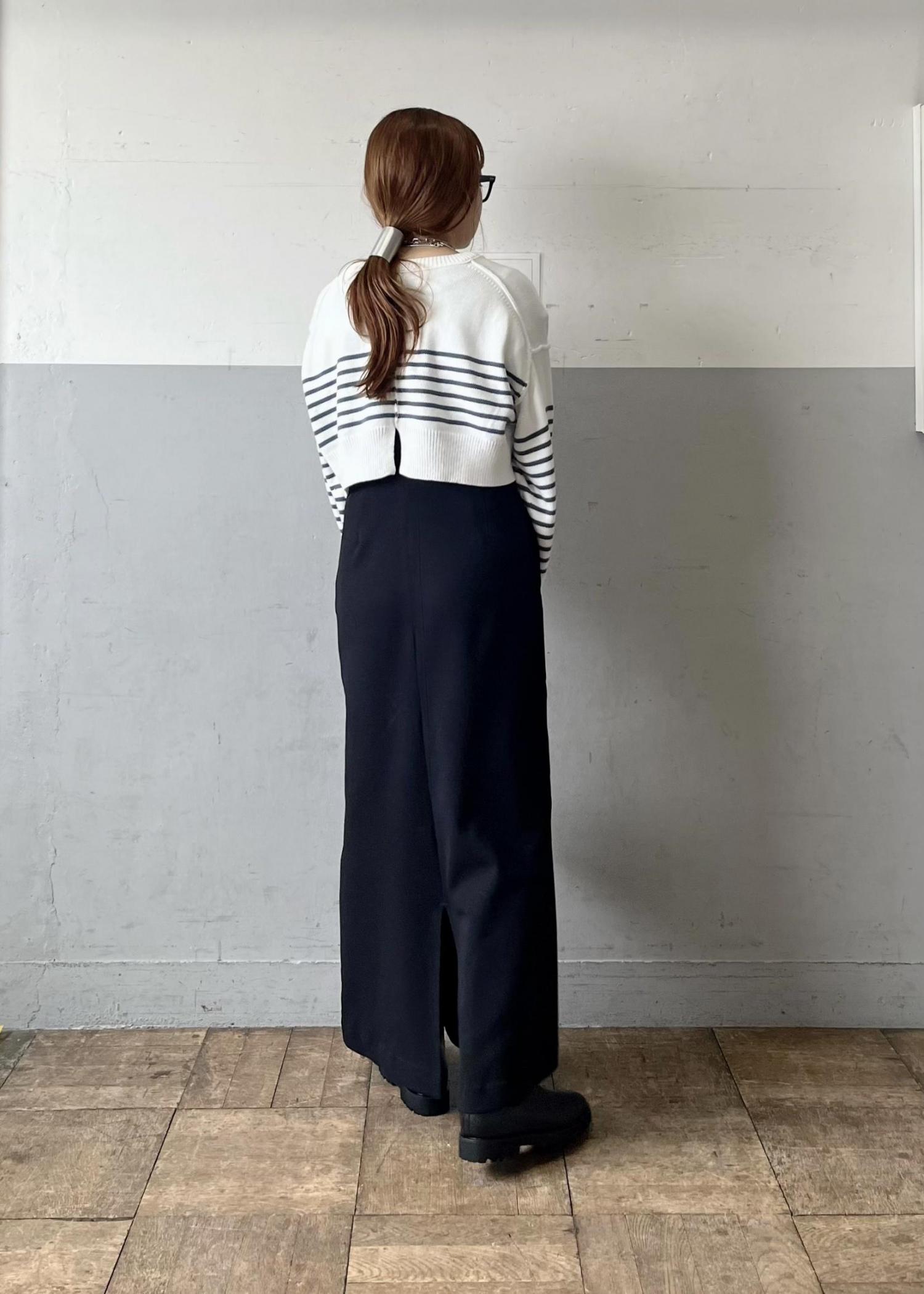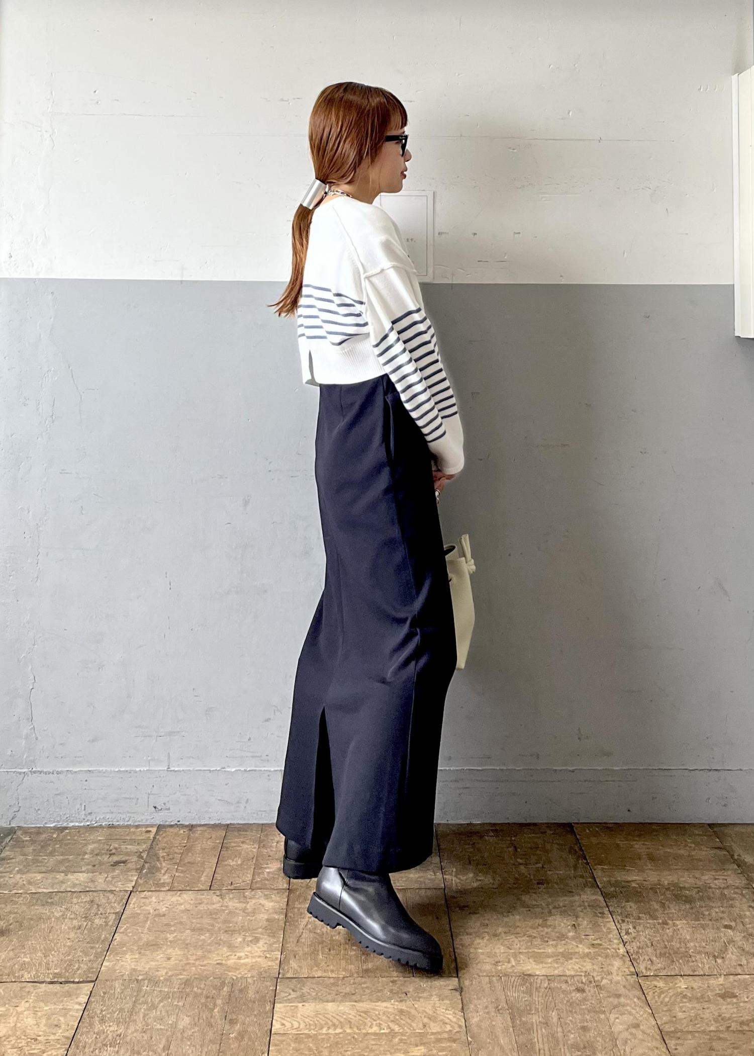 スリットが入っているので、チラリとロングブーツをのぞかせるとグッと季節感・トレンド感も出ますよ。